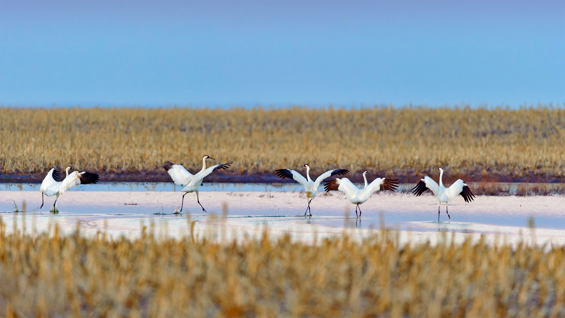Whooping cranes taking off during spring migration in 南达科他州 (© Gerrit Vyn/Minden Pictures)